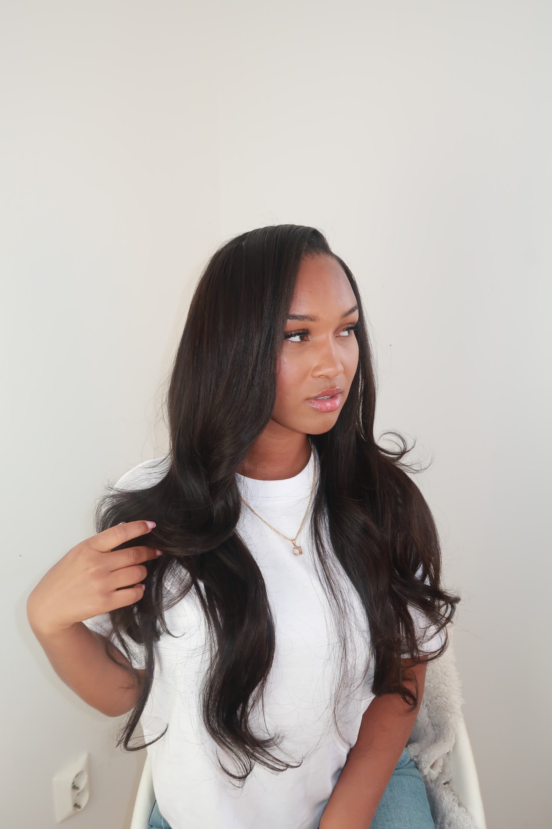 Matildas (jag) erbjuder vårt silky straight hair i färgen almost black. Jag har tre sew- in bundels i längderna 22,24,26 iches